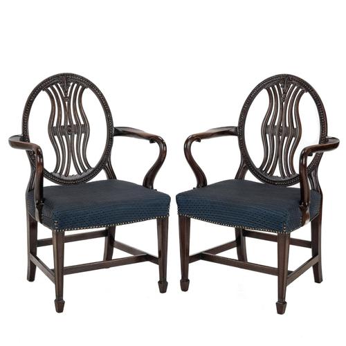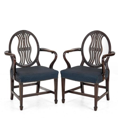 Set of Six Georgian Mahogany Dining Chairs, Sheraton Style, Including a Pair of Open Armchairs, c.1800 (George III, Carvers, Elbow Chairs)