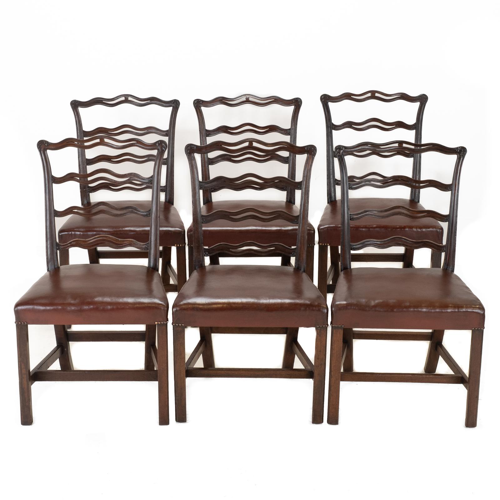 A very attractive set of six late 19th-century mahogany dining chairs in the Chippendale revival taste, dating from circa 1870–1890. Each chair is of classic ladderback form, with a gently swept top rail above a series of shaped, wavy slats incorporating delicate pierced details, framed by slightly raked rear uprights. The design is well judged and elegant, closely informed by 18th-century Chippendale models while retaining the strength and comfort expected of later Victorian dining furniture.
